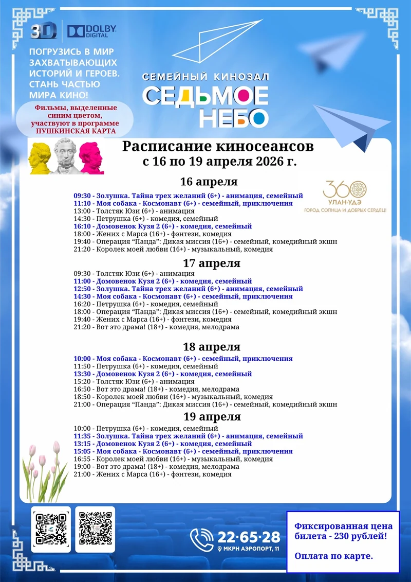 25 АПРЕЛЯ (суббота) семейный кинозал «Седьмое небо» НЕ РАБОТАЕТ‼️